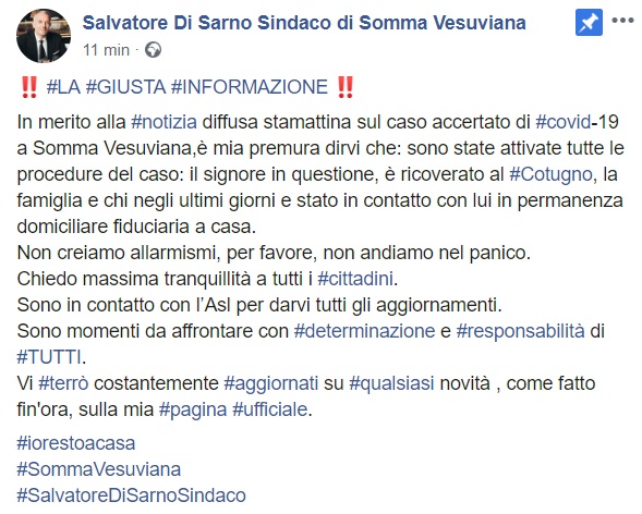 Questo quanto apprendiamo dalla pagina facebook del Sindaco Di Sarno: