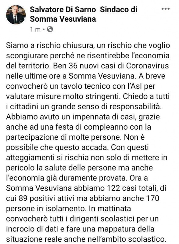Questo quanto pubblicato sul profilo facebook dal Sindaco Di Sarno