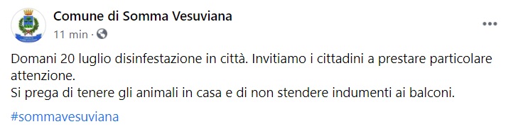 Questo quanto pubblicato sulla pagina facebook del Comune di Somma Vesuviana: