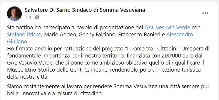 Questo quanto pubblicato sulla pagina fb del Sindaco di Somma Vesuviana: "Stamattina ho partecipato al tavolo di progettazione del GAL Vesuvio Verde con Stefano Prisco, Mario Addeo, Genny Falciano, Francesco Ranieri e - si legge nella nota - Alessandro Giuliano. Ho firmato anch'io per l'attuazione del progetto "Il Parco tra i Cittadini" Un'opera di fondamentale importanza per il nostro territorio, finanziata con 200.000 euro dal GAL Vesuvio Verde, che si pone come ambizioso obiettivo quello di riqualificare il Museo Etno-Storico delle Genti Campane, rendendolo polo di ricezione turistica della nostra città. Siamo costantemente al lavoro - si legge nella nota - per rendere Somma Vesuviana una città sempre più bella, innovativa e a misura di cittadino."
