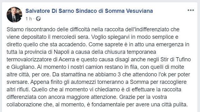 Questo quanto comunicato dal Sindaco di Somma Vesuviana Salvatore Di Sarno