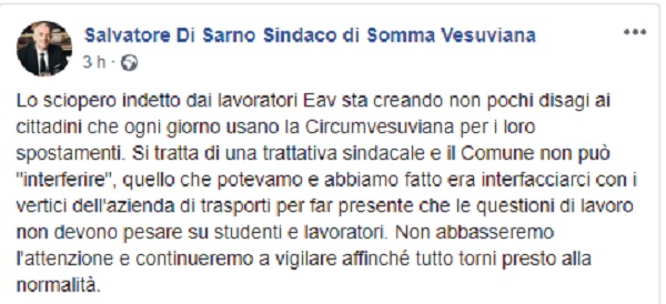 Questo il post pubblicato sulla pagina fb ufficiale del Sindaco di Somma Vesuviana Salvatore Di Sarno.