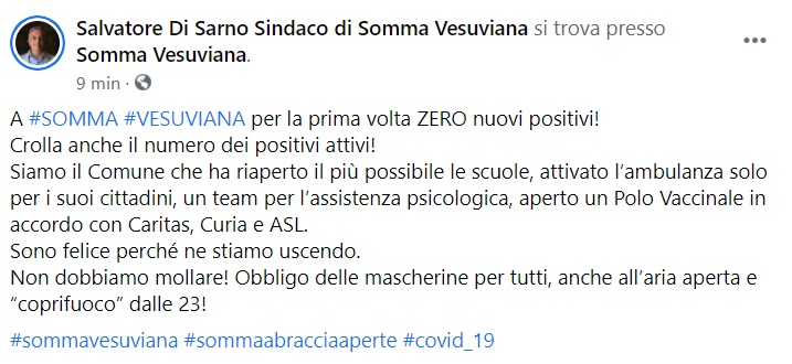 "A #SOMMA #VESUVIANA per la prima volta ZERO nuovi positivi! Crolla anche il numero dei positivi attivi! Siamo il Comune che ha riaperto il più possibile le scuole, attivato l’ambulanza solo per i suoi cittadini, un team per l’assistenza psicologica, aperto- si legge nella nota- un Polo Vaccinale in accordo con Caritas, Curia e ASL. Sono felice perché ne stiamo uscendo. Non dobbiamo mollare! Obbligo delle mascherine per tutti, anche all’aria aperta e “coprifuoco” dalle 23!"