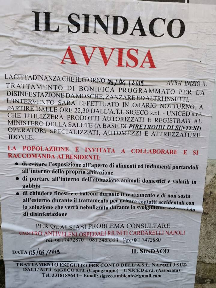 "Domani sarà effettuato il trattamento di bonifica programmato per la disinfestazione delle mosche, zanzare e altri insetti. L'intervento sarà effettuato in orario notturno (dalle ore 22.30) con operatori specializzati, automezzi e attrezzature idonee. Cari cittadini, siete tutti invitati a collaborare, a tal fine si raccomanda di evitare l'esposizione all'aperto di alimenti ed indumenti, portandoli all'interno della propria abitazione, di portare all'interno dell'abitazione anche animali domestici e volatili in gabbia, di chiudere finestre e balconi durante il trattamento e di non sostare all'esterno durante il trattamento per evitare il contatto accidentale con la soluzione che verrà nebulizzata durante lo svolgimento del servizio di disinfestazione."