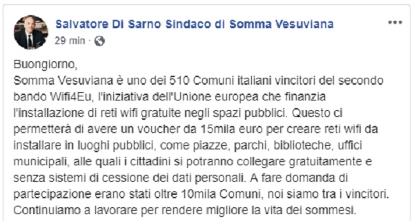 Questo il post pubblciato sulla bacheca fb ufficiale del Sindaco di Somma Vesuviana Salvatore Di Sarno.