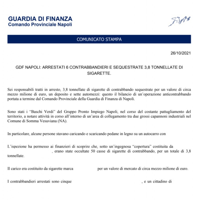 "Sei responsabili tratti in arresto, 3,8 tonnellate di sigarette di contrabbando sequestrate per un valore di circa mezzo milione di euro, un deposito e sette automezzi: questo il bilancio di un’operazione anticontrabbando portata a termine dal Comando Provinciale della Guardia di Finanza di Napoli. -Si legge nella nota- Sono stati i “Baschi Verdi” del Gruppo Pronto Impiego Napoli, nel corso del costante pattugliamento del territorio, a notare attività in corso all’interno di un’area di collegamento tra due grossi capannoni industriali nel Comune di Somma Vesuviana (NA). In particolare, alcune persone stavano caricando e scaricando pedane in legno su un autocarro con ... L’ispezione ha permesso ai finanzieri di scoprire che, sotto un’ingegnosa “copertura” costituita da ... , erano state occultate 50 casse di sigarette di contrabbando, per un totale di 3,8 tonnellate. -Si legge nella nota- Il carico era costituito da sigarette marca ... per un valore di mercato di circa mezzo milione di euro. I contrabbandieri arrestati sono cinque ... , e un cittadino ..."