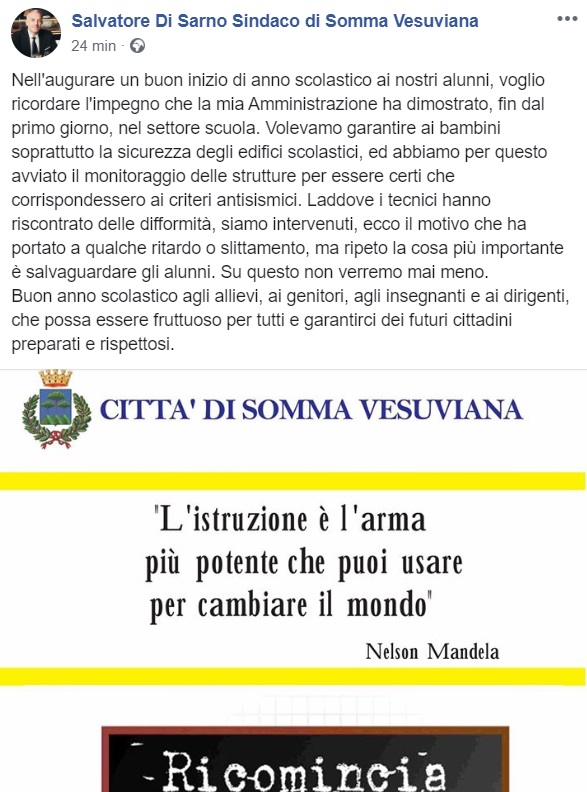 Questo quanto pubblicato dalla pagina Facebook del Sindaco di Somma Vesuviana, Salvatore Di Sarno: