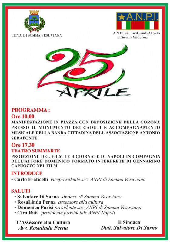 Questo il comunicato stampa diffuso dall'Anpi di Somma Vesuviana: "Somma Vesuviana. La proiezione di un film significativo ed un ospite d’eccezione, così la sezione Anpi (Associazione Nazionale Partigiani d'Italia) di Somma Vesuviana ha deciso di celebrare l’anniversario della liberazione d'Italia. La sezione sommese che porta il nome - si legge nel comunicato - del partigiano Ferdinando Aliperta, con il patrocinio del Comune di Somma Vesuviana, presenta lunedì 25 aprile alle ore 17,30 al teatro Summarte di via Roma 15 la proiezione del film “Le quattro giornate di Napoli” alla presenza dell’attore Domenico Formato (Gennarino Capuozzo nella pluripremiata pellicola del regista Nanni Loy). Introduce Carlo Fraticelli vicepresidente della locale sezione Anpi - si legge ancora - sono poi previsti i saluti di Salvatore Di Sarno sindaco di Somma Vesuviana, RosaLinda Perna assessore alla Cultura, Ciro Raia presidente provinciale ANPI Napoli e Domenico Parisi presidente sez. ANPI di Somma Vesuviana. “Per celebrare la giornata della Liberazione abbiamo scelto di completare la manifestazione con la proiezione del film sulle quattro giornate di Napoli”, spiega Domenico Parisi, presidente della sezione sommese dell’Anpi, “per ricordare a tutti quello che Luigi Longo - prosegue il comunicato - indimenticabile comandante partigiano, aveva già scritto nel 1947 nel suo “ Un Popolo alla macchia”: Dopo le quattro giornate di Napoli, la parola d'ordine dell'insurrezione finale acquistò un senso e un valore. Questo per sottolineare che l’azione del popolo napoletano indicò la strada di marcia per la parte più audace della Resistenza italiana. Ci è sembrato anche il modo - si legge ancora nel comunicato - più appropriato per lanciare, in anteprima, una serie di iniziative dell’ANPI di Napoli in occasione dell’ottantesimo anniversario delle storiche giornate a cui sta lavorando il nostro Presidente provinciale Ciro Raia. Iniziative che - recita ancora il comunicato - tra l’altro, riguarderanno anche l’ottobre del ’43 a Somma Vesuviana".