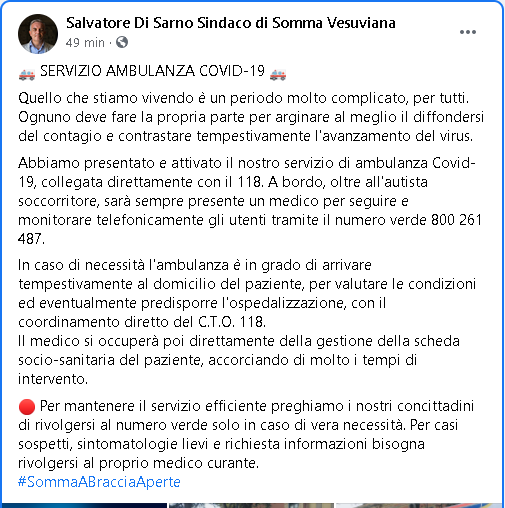 Lo apprendiamo dalla pagina Facebook di Salvatore Di Sarno, Sindaco di Somma Vesuviana.