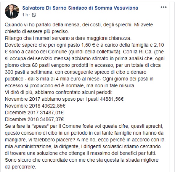 Questo il post pubblicato sulla pagina fb ufficiale del Sindaco di Somma Vesuviana Salvatore Di Sarno.