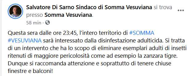 Questo il post pubblicato sulla pagina Facebook del sindaco di Somma Vesuviana, Salvatore di Sarno: "Questa sera dalle ore 23:45, l’intero territorio di SOMMA VESUVIANA sarà interessato dalla disinfestazione adulticida. Si tratta - si legge nel post - di un intervento che ha lo scopo di eliminare esemplari adulti di insetti ritenuti di maggiore pericolosità come ad esempio la zanzara tigre. Dunque si raccomanda attenzione e soprattutto di tenere chiuse finestre e balconi - conclude".