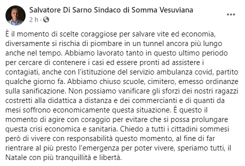 Lo apprendiamo dalla pagina Facebook del Sindaco di Somma Vesuviana Di Sarno