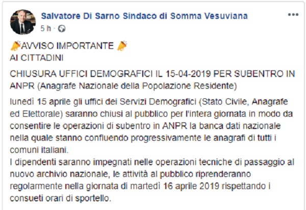 Questo il post pubblicato sulla pagina fb ufficiale del Sindaco di Somma Vesuviana Salvatore Di Sarno.