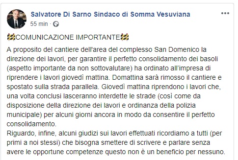 Questo il post pubblicato sulla pagina fb ufficiale del Sindaco di Somma Vesuviana Salvatore Di Sarno.