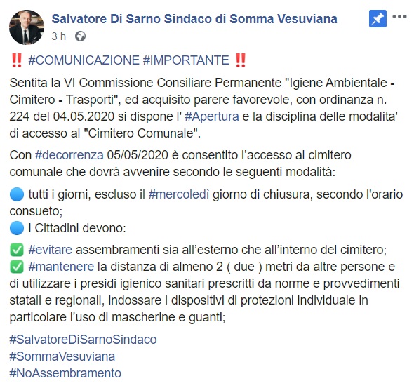 Questo quanto pubblicato sulla pagina facebook del Sindaco Di Sarno: