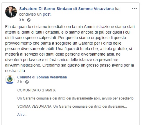 Il Sindaco di Somma Vesuviana Salvatore Di Sarno ha espresso la sua soddisfazione per quanto segue