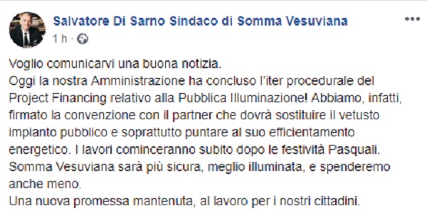 Questo il post pubblicato sulla pagina fb ufficiale del Sindaco di Somma Vesuviana Salvatore Di Sarno.