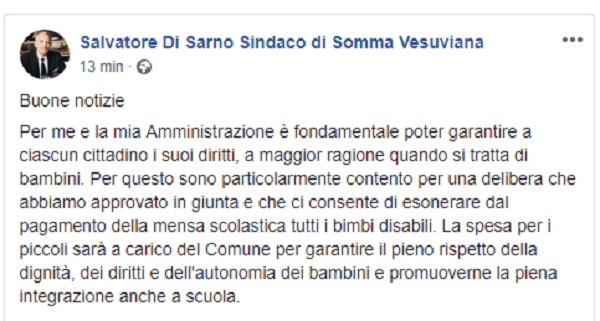Questo il post pubblicato sulla pagina fb ufficiale del Sindaco di Somma Vesuviana Salvatore Di Sarno.