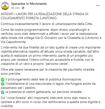 Questo il post pubblicato sulla pagina Facebook Sparanise in Movimento: "Affidati i lavori per la realizzazione della strada di collegamento Foresta S.Antonio. Continua incessantemente il lavoro di urbanizzazione della Città. Come da nostra programmazione, dopo diversi sopralluoghi e verifiche - si legge nel post - sono stati determinati e affidati i lavori per la realizzazione della strada che collega Via Di Giovanni con la Chiesetta di S.Antonio e Via Capodimonte. L'intervento ha due finalità: da un lato quella di creare una importante viabilità alternativa rispetto all'attuale unica strada carrabile, dall'altro quella di realizzare un primo intervento, parte di un progetto più ampio, per rendere l'intera collina più accessibile e fruibile, con la creazione di un vero e proprio "percorso verde". Oltre - prosegue il post - alle opere necessarie per la creazione del pacchetto stradale sono previste:il prolungamento della rete di pubblica illuminazione, l'installazione di una staccionata in legno che fungerà anche da passamano per i pedoni, la presenza di cestini gettacarta, sul percorso stradale. Sul "rione foresta" - conclude il post - altri importanti interventi sono stati messi in cantiere e altri sono in corso che restituiranno a questa zona dignità e vivibilità".