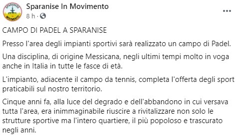 Questo il post pubblicato sulla pagina Facebook Sparanise in Movimento. "Presso l'area degli impianti sportivi sarà realizzato un campo di Padel. Una disciplina, di origine Messicana, negli ultimi tempi molto in voga anche in Italia in tutte le fasce di età. L'impianto, adiacente il campo da tennis, completa l'offerta degli sport praticabili sul nostro territorio. Cinque anni fa - prosegue il post - alla luce del degrado e dell'abbandono in cui versava tutta l'area, era inimmaginabile riuscire a rivitalizzare non solo le strutture sportive ma l'intero quartiere, il più popoloso e trascurato negli anni".