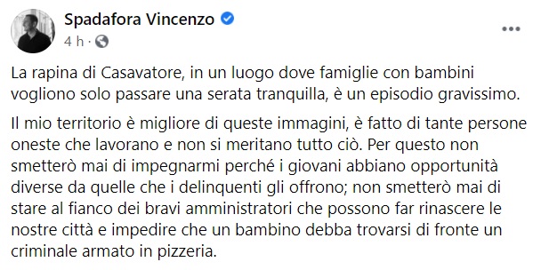 Questo quanto apprendiamo dalla pagina facebook del già Ministro delle Politiche giovanili e dello Sport Spadafora: "La rapina di Casavatore, in un luogo dove famiglie con bambini vogliono solo passare una serata tranquilla - si legge nella nota -, è un episodio gravissimo. Il mio territorio è migliore di queste immagini, è fatto di tante persone oneste che lavorano e non si meritano tutto ciò. Per questo non smetterò mai di impegnarmi perché i giovani abbiano opportunità diverse da quelle che i delinquenti gli offrono - si legge nella nota -; non smetterò mai di stare al fianco dei bravi amministratori che possono far rinascere le nostre città e impedire che un bambino debba trovarsi di fronte un criminale armato in pizzeria."