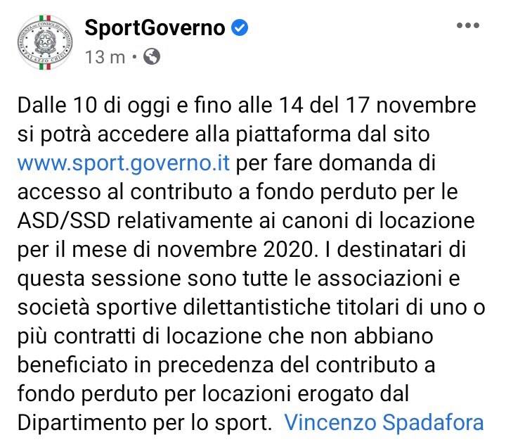 Questo quanto pubblicato sulla pagina fb di Sport Governo
