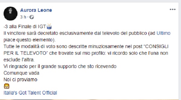 Questo il post pubblicato sulla bacheca fb di Aurora Leone.