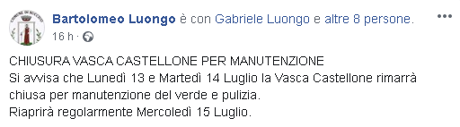 Si avvisa che Lunedì 13 e Martedì 14 Luglio la Vasca Castellone rimarrà chiusa per manutenzione del verde e pulizia. Riaprirà regolarmente Mercoledì 15 Luglio."