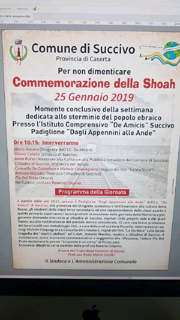 "Si conclude domani la settimana - si legge nel post - di iniziative dedicate alla Shoah. Nel manifesto il dettaglio della manifestazione fortemente voluta dall'Assessore alla Cultura - conclude il post - Anna Russo".