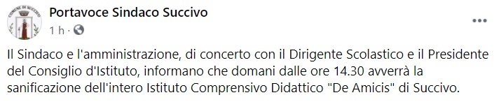 Questo quanto apprendiamo dalla pagina fb del Portavoce del Sindaco di Succivo: "Il Sindaco e l'amministrazione, di concerto con il Dirigente Scolastico e il Presidente del Consiglio d'Istituto - si legge nella nota -, informano che domani dalle ore 14.30 avverrà la sanificazione dell'intero Istituto Comprensivo Didattico "De Amicis" di Succivo."