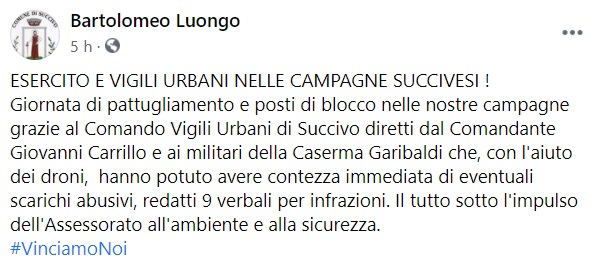 "ESERCITO E VIGILI URBANI NELLE CAMPAGNE SUCCIVESI ! Giornata di pattugliamento e posti di blocco nelle nostre campagne grazie al Comando Vigili Urbani di Succivo diretti dal Comandante Giovanni Carrillo e ai militari della Caserma Garibaldi che, con l'aiuto dei droni, hanno potuto avere contezza immediata- si legge nella nota- di eventuali scarichi abusivi, redatti 9 verbali per infrazioni. Il tutto sotto l'impulso dell'Assessorato all'ambiente e alla sicurezza."