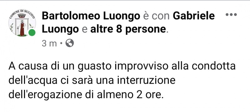 "A causa di un guasto improvviso alla condotta dell'acqua ci sarà una interruzione dell'erogazione di almeno 2 ore."