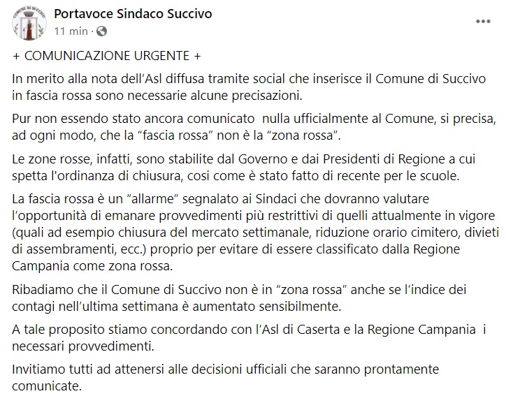 Questo quanto pubblicato sulla pagina fb del Portavoce del Sindaco di Succivo: "COMUNICAZIONE URGENTE In merito alla nota dell’Asl diffusa tramite social che inserisce il Comune di Succivo in fascia rossa sono necessarie alcune precisazioni. Pur non essendo stato ancora comunicato nulla ufficialmente al Comune - si legge nella nota -, si precisa, ad ogni modo, che la “fascia rossa” non è la “zona rossa”. Le zone rosse, infatti, sono stabilite dal Governo e dai Presidenti di Regione a cui spetta l'ordinanza di chiusura, cosi come è stato fatto di recente per le scuole. La fascia rossa è un “allarme” segnalato ai Sindaci che dovranno valutare l’opportunità di emanare provvedimenti più restrittivi di quelli attualmente in vigore (quali ad esempio chiusura del mercato settimanale, riduzione orario cimitero, divieti di assembramenti, ecc.) proprio per evitare - si legge nella nota - di essere classificato dalla Regione Campania come zona rossa. Ribadiamo che il Comune di Succivo non è in “zona rossa” anche se l’indice dei contagi nell’ultima settimana è aumentato sensibilmente. A tale proposito stiamo concordando con l’Asl di Caserta e la Regione Campania i necessari provvedimenti. Invitiamo tutti ad attenersi alle decisioni ufficiali - si legge nella nota - che saranno prontamente comunicate."