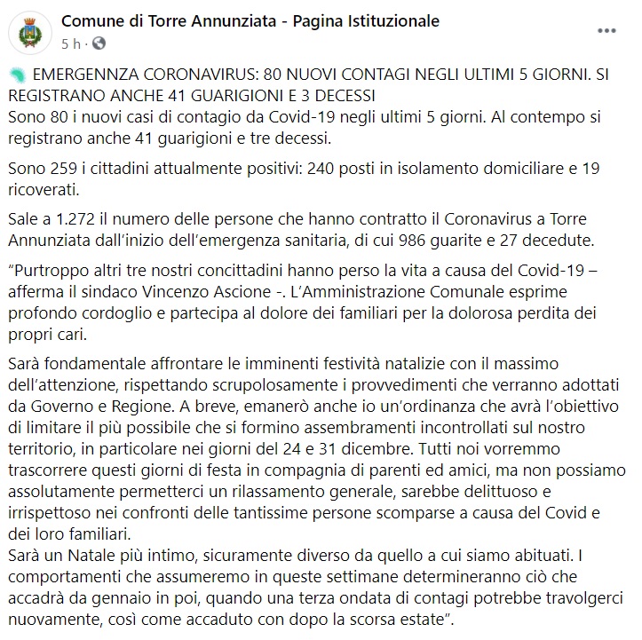 Questo quanto apprendiamo dalla pagina facebook del Comune di Torre Annunziata: