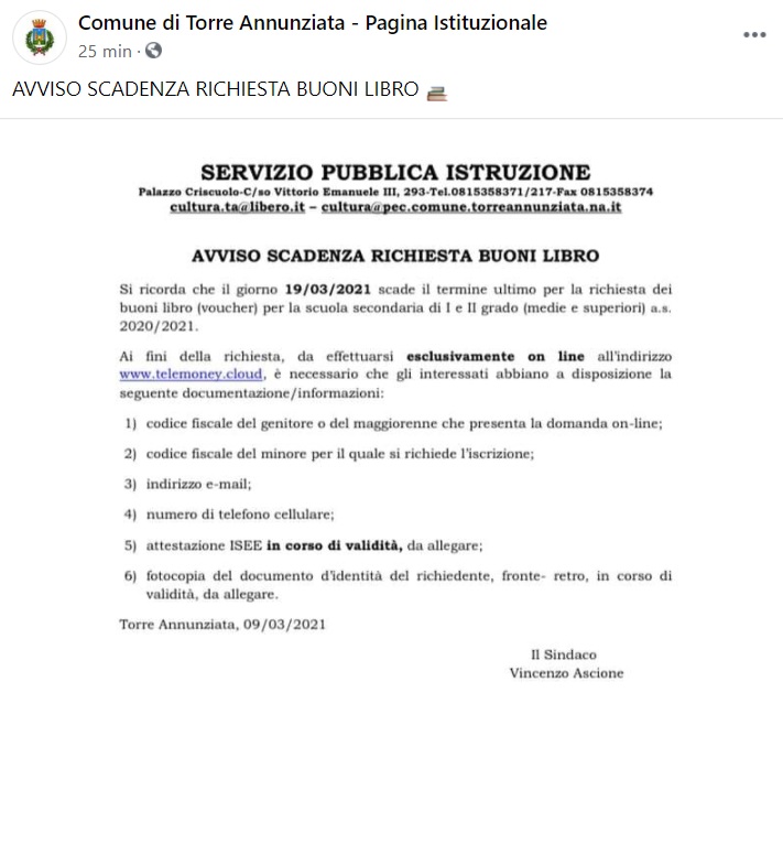 Questo quanto apprendiamo dalla pagina facebook di Torre Annunziata: