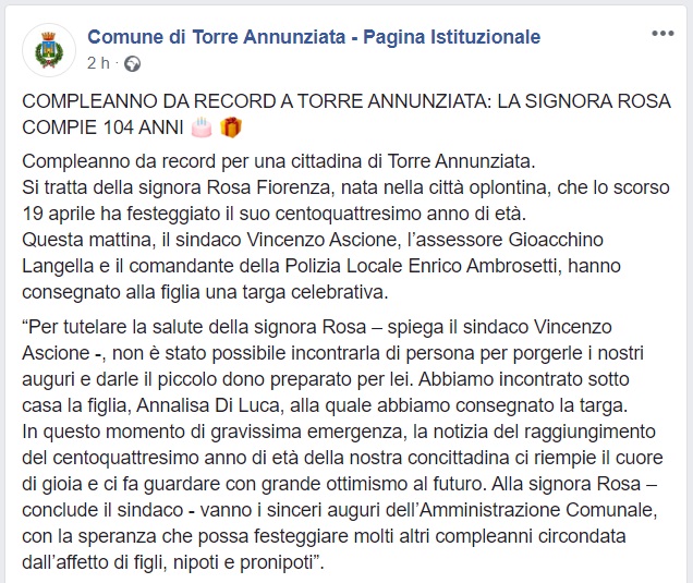 Questo quanto comunicato dal Comune di Torre Annunziata