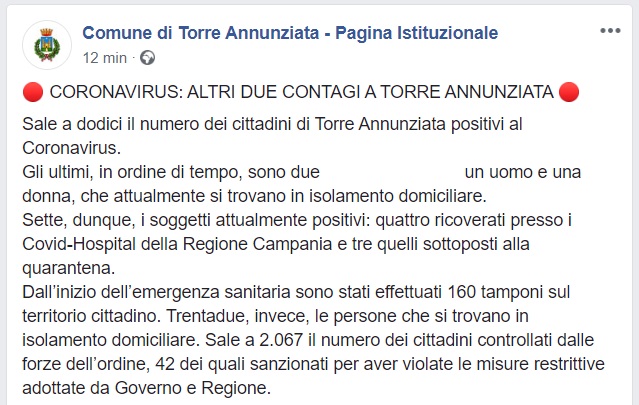Questo quanto comunicato dal Comune di T. Annunziata