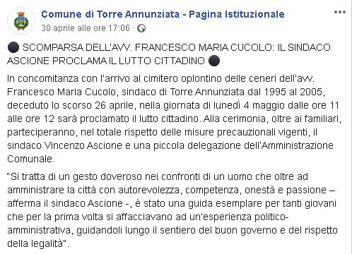 In concomitanza con l’arrivo al cimitero oplontino delle ceneri dell’avv. Francesco Maria Cucolo, sindaco di Torre Annunziata dal 1995 al 2005, deceduto lo scorso 26 aprile, nella giornata di lunedì 4 maggio dalle ore 11 alle ore 12 sarà proclamato il lutto cittadino. Alla cerimonia, oltre ai familiari, parteciperanno, nel totale rispetto delle misure precauzionali vigenti, il sindaco Vincenzo Ascione e una piccola delegazione dell’Amministrazione Comunale. “Si tratta di un gesto doveroso nei confronti di un uomo che oltre ad amministrare la città con autorevolezza, competenza, onestà e passione – afferma il sindaco Ascione -, è stato una guida esemplare per tanti giovani che per la prima volta si affacciavano ad un’esperienza politico-amministrativa, guidandoli lungo il sentiero del buon governo e del rispetto della legalità”."