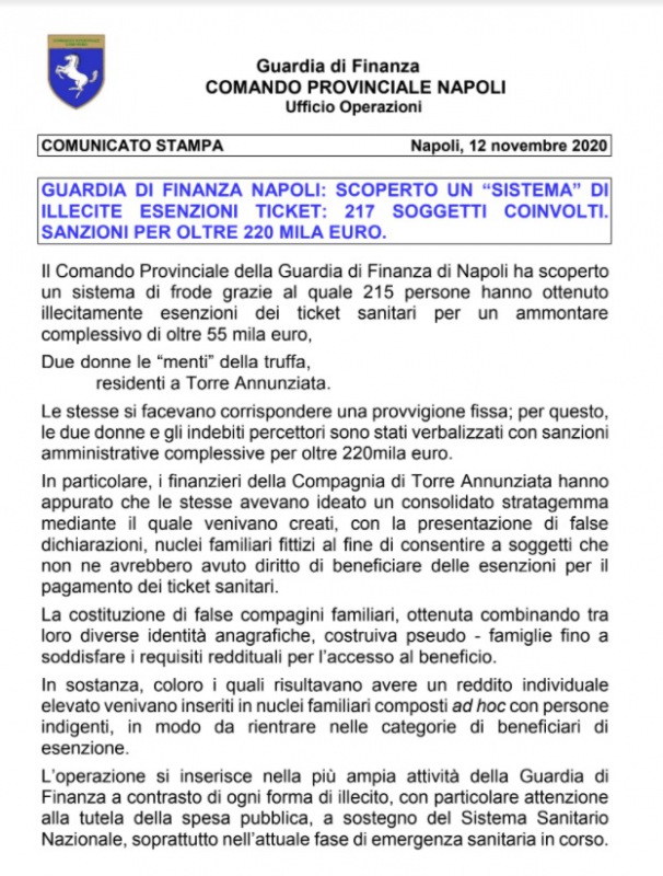 Questa parte della nota stampa della Guardia di Finanza di Napoli: