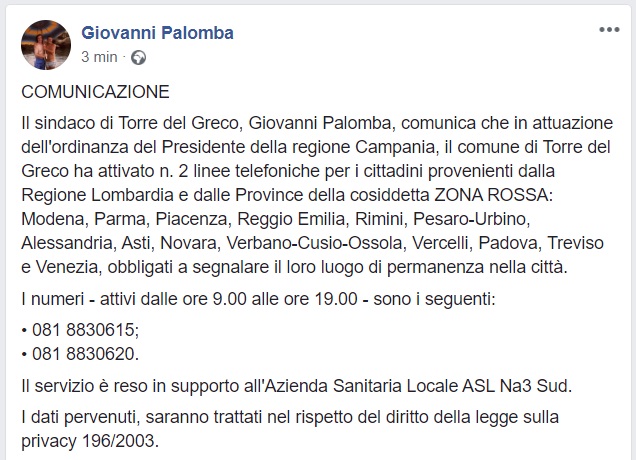 Questo quanto pubblicato dal Sindaco Palomba sul proprio profilo FB