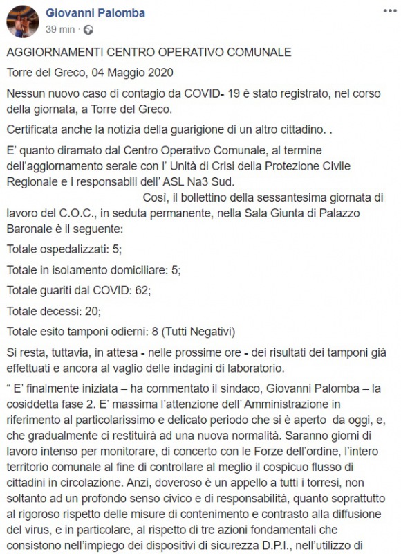 Questo quanto apprendiamo dal profilo facebook del Sindaco Palomba: