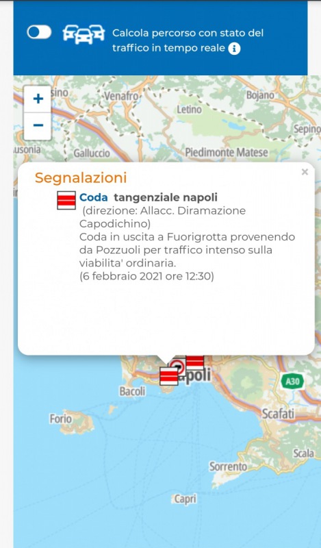 "Coda tangenziale napoli (direzione: Allacc. Diramazione Capodichino). Coda in uscita a Fuorigrotta provenendo da Pozzuoli per traffico intenso sulla viabilita' ordinaria. (6 febbraio 2021 ore 12:30)".