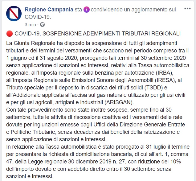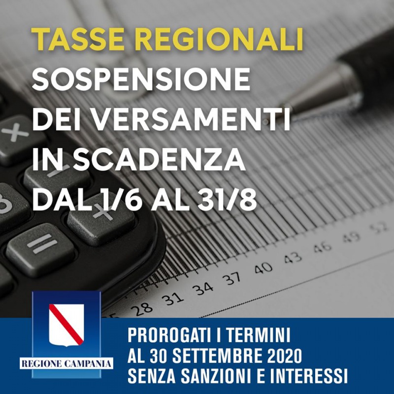 Tasse regionali. Sospensione dei versamenti in scadenza dal 1/6 al 31/8