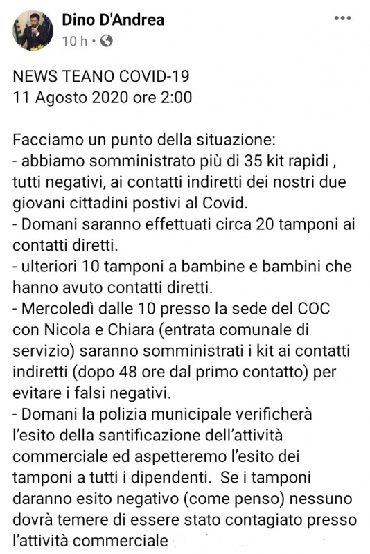 Questo quanto comunicato dal Sindaco di Teano
