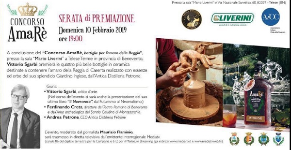 Sarà Vittorio Sgarbi l'ospite d'eccezione della serata prevista per domenica 10 alle ore 19 presso la Sala 'Mario Liverini', a Telese Terme in occasone del 'Concorso Amarè, bottgilie per l'amaro della Reggia'