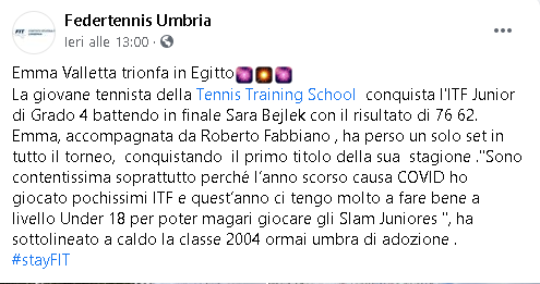 "Emma Valletta trionfa in Egitto. La giovane tennista della Tennis Training School conquista l'ITF Junior di Grado 4 battendo in finale Sara Bejlek con il risultato di 76 62. Emma, accompagnata da Roberto Fabbiano , ha perso un solo set in tutto il torneo, conquistando il primo titolo della sua stagione ."Sono contentissima soprattutto perché l’anno scorso causa COVID ho giocato pochissimi ITF e quest’anno ci tengo molto a fare bene a livello Under 18 per poter magari giocare gli Slam Juniores ", ha sottolineato a caldo la classe 2004 ormai umbra di adozione."
