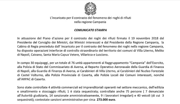 Questo parte del Comunicato inviatoci dall'Ufficio dell'Incaricato per il contrasto del fenomeno dei roghi di rifiuti nella Regione Campania.