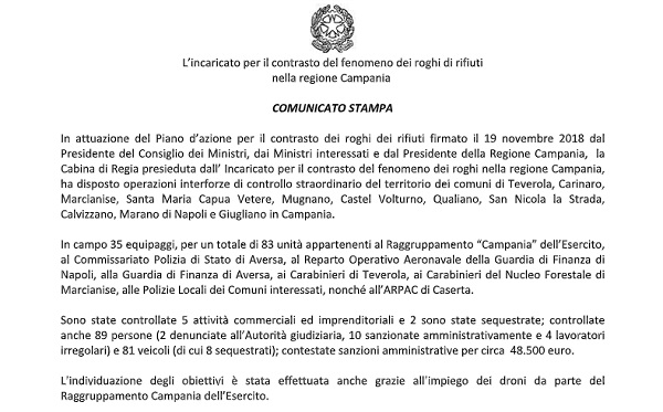 Questo il comunicato inviatoci dall'Ufficio dell'incaricato per il contrasto del fenomeno dei roghi di rifiuti nella Regione Campania.