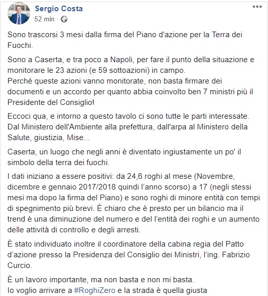 Il Ministro dell'Ambiente Sergio Costa fa il punto della situazione attraverso il suo profilo Facebook