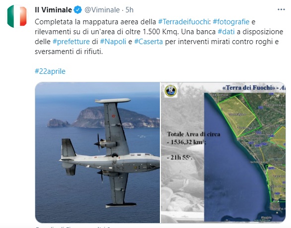 Questo quanto apprendiamo dal profilo twitter de Il Viminale: "Completata la mappatura aerea della Terra dei fuochi: fotografie e rilevamenti su di un'area di oltre 1.500 Kmq - si legge nella nota -. Una banca dati a disposizione delle prefetture di Napoli e Caserta per interventi mirati contro roghi e sversamenti di rifiuti."
